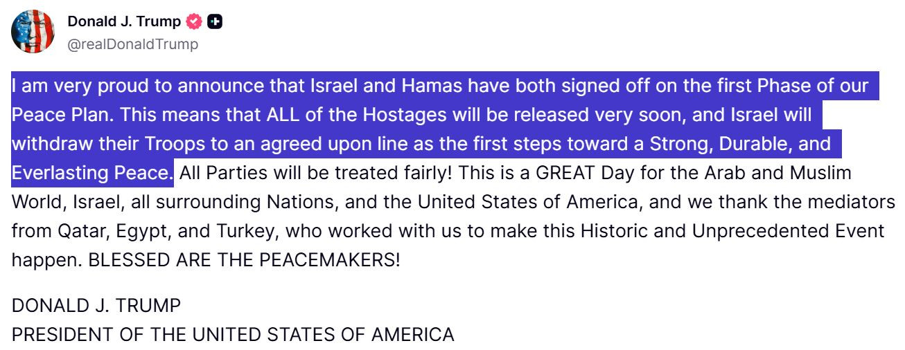 트럼프 대통령은 현지시간 8일 자신의 소셜미디어 트루스소셜을 통해 "이스라엘과 하마스가 우리의 평화 계획 1단계에 모두 동의했다는 사실을 자랑스럽게 알린다"고 밝혔습니다.