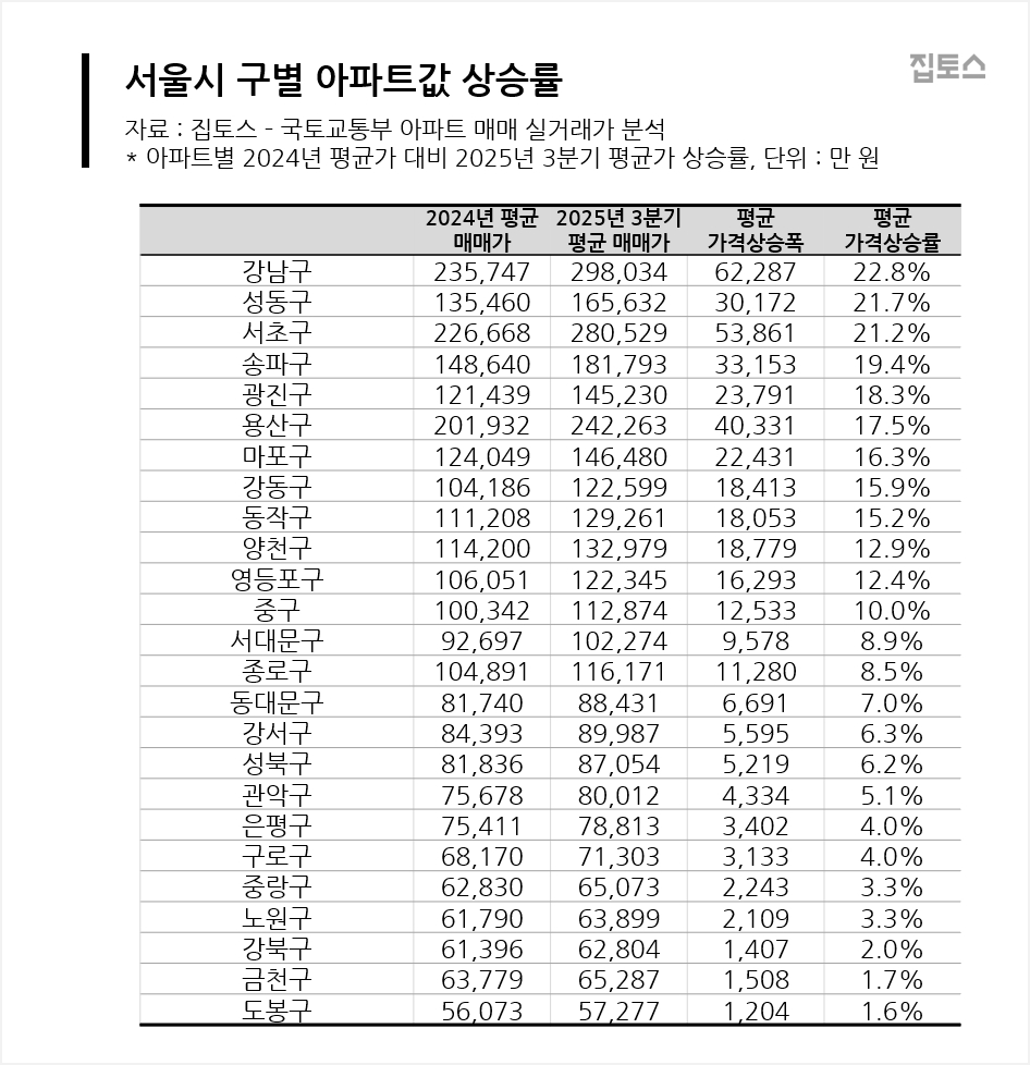 집토스 제공연식별로는 서울 아파트 시장의 경우 입주 5∼10년차 준신축이 평균 2억4,127만원 올라 13.9%의 높은 상승률을 기록했고, 30년 초과 아파트도 재건축 기대감으로 평균 2억3,322만원(13.8%↑) 올랐습니다.