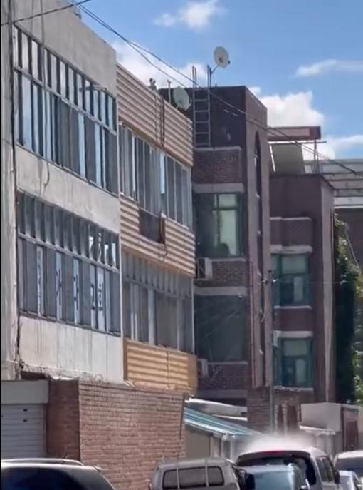 영상에는 빌라로 보이는 건물 옥상에서 물을 뿌려 건물 옆에 주차된 차량을 적시고 있는 모습이 담겼습니다.