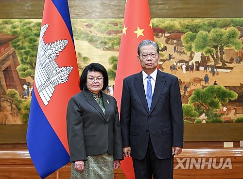 14일 캄보디아 국회의장(왼쪽) 만난 자오러지 중국 전국인민대표대회 상무위원장[신화=연합뉴스 자료사진 제공][신화=연합뉴스 자료사진 제공]