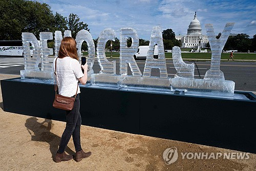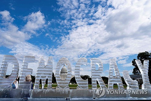 미국 내셔널몰에 설치된 '민주주의' 얼음 조각상 [AFP 연합뉴스]미국 내셔널몰에 설치된 '민주주의' 얼음 조각상 [AFP 연합뉴스]미국 워싱턴 D.C. 국회의사당 근처 공원 내셔널몰에 '민주주의'라고 적힌 얼음 조각상이 설치됐습니다.