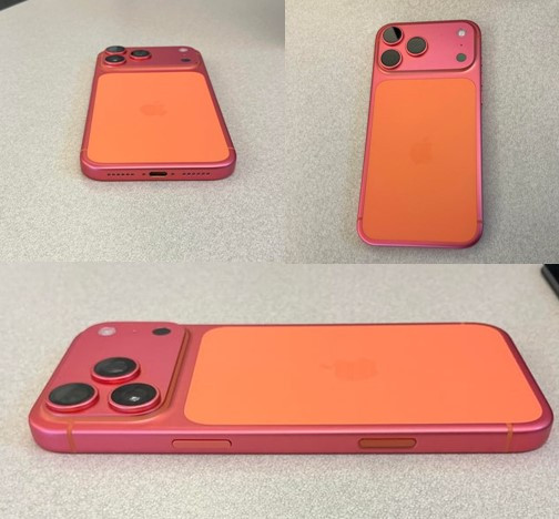 공개된 사진 속 아이폰의 후면 유리는 여전히 오렌지색이지만, 금속 프레임은 전체적으로 짙은 분홍빛을 띠고 있는 모습입니다.