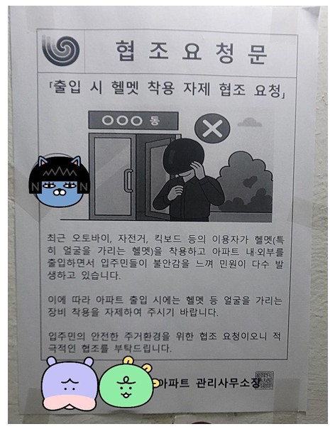 해당 아파트 관리사무소 측은 “최근 오토바이, 자전거, 킥보드 이용자가 얼굴을 가리는 헬멧을 착용하고 출입해 입주민들이 불안감을 느낀다는 민원이 다수 발생했다”며 “출입 시 얼굴을 가리는 장비 착용을 자제해 달라”고 안내했습니다.