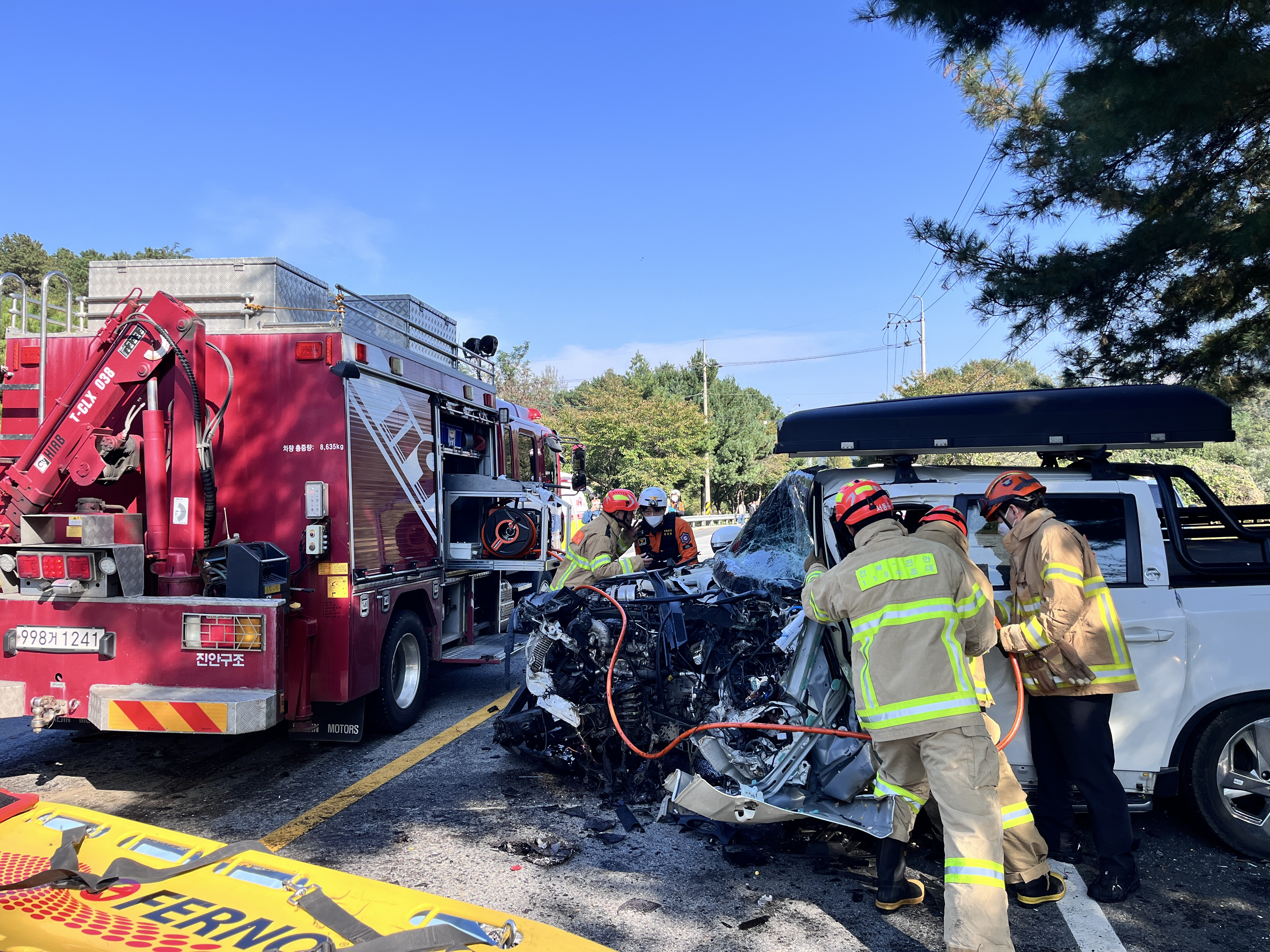 전북 진안서 마주 오던 차량 출동…1명 사망·3명 중경상[전북도소방본부·재판매 및 DB금지][전북도소방본부·재판매 및 DB금지]어제(20일) 낮 2시 5분쯤 전북 진안군 상전면 한 도로에서 SUV 차량과 트럭이 부딪치는 사고가 발생했습니다.