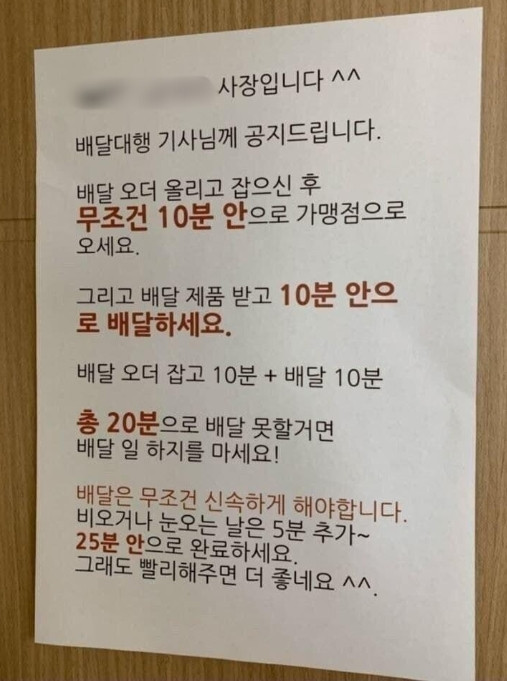 음식점 사장은 "배달은 무조건 신속해야 한다"며 "비나 눈이 오는 날은 5분 추가해 25분 안으로 완료하라"고 덧붙였습니다.