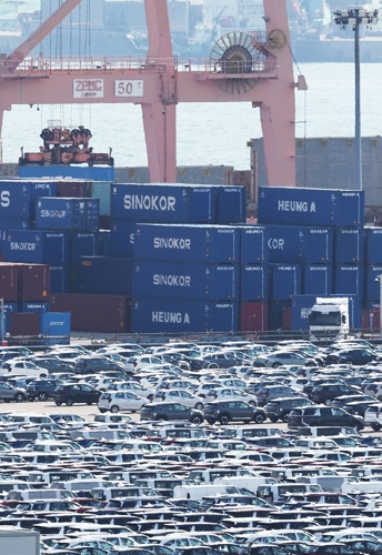 사진은 16일 경기도 평택항에 수출 대기 중인 자동차 뒤로 컨테이너가 쌓여 있는 모습. 2025.10.16