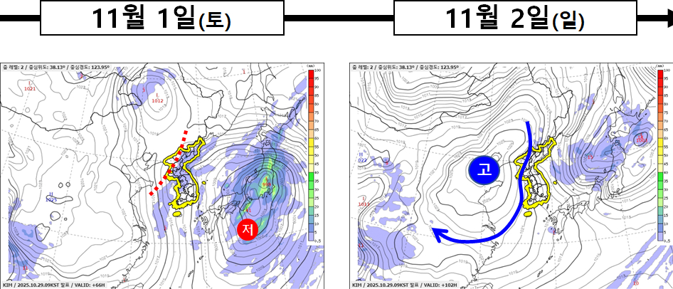 11월 1~2일 예상 기압계 모식도[기상청 제공][기상청 제공]비구름이 물러간 1일(토) 오후부터는 북쪽 대륙에서 고기압이 재차 확장하면서 한반도로 다시 찬 바람이 강하게 불어오겠습니다.