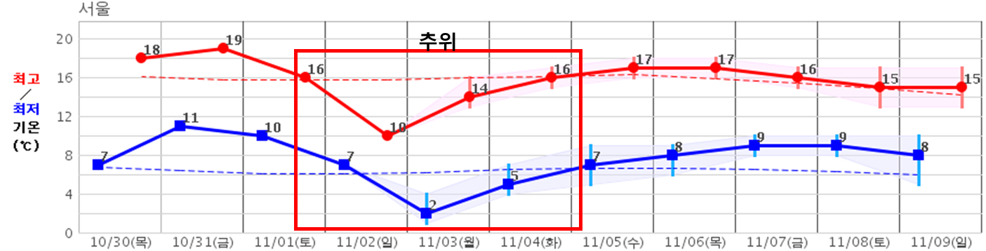 1일(토) 낮부터 기온이 급감하겠고, 2일(일)은 서울의 낮 최고 기온이 10도에 머물며 종일 쌀쌀하겠습니다.