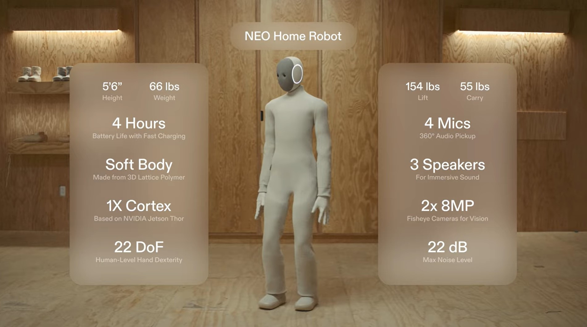 네오는 설거지, 빨래, 물건 가져오기, 조명 끄기 등 다양한 집안일을 수행하며, 음성 명령으로 작동합니다.