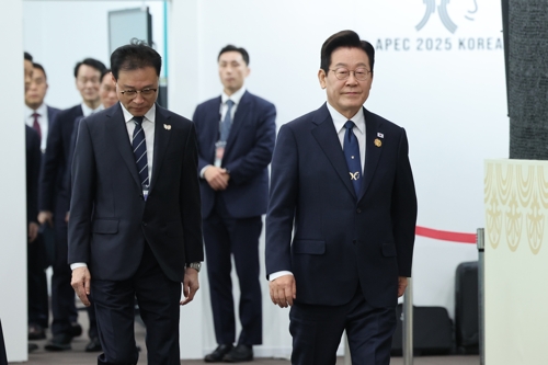 (경주=연합뉴스) 특별취재단 = 이재명 대통령이 1일 경주화백컨벤션센터(HICO)에서 열린 2025 아시아태평양경제협력체(APEC) 정상회의 기자회견에서 입장하고 있다. 2025.11.1