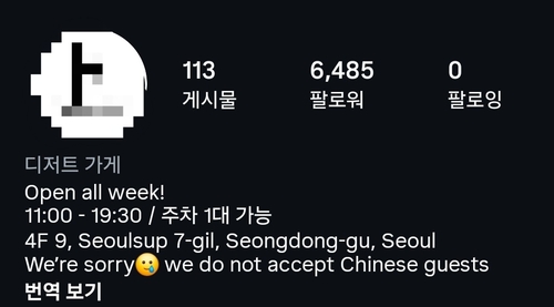 '중국인 안 받는다' 문구 게시한 성동구 성수동 카페 인스타그램 게시물[인스타그램 캡처.재판매 및 DB 금지][인스타그램 캡처.재판매 및 DB 금지]국가인권위원회가 중국인 손님을 받지 않겠다고 공언해 논란이 된 서울 성수동의 한 카페를 조사했습니다.