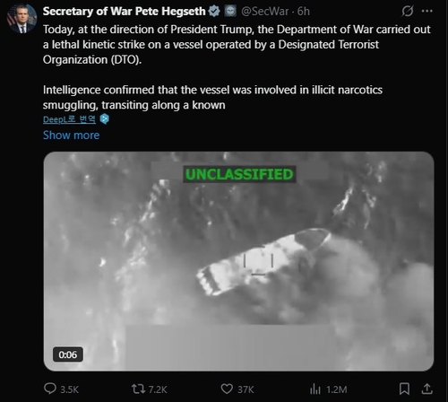 AP통신에 따르면 피트 헤그세스 미 국방부(전쟁부) 장관은 현지시간 4일 엑스(X)를 통해 "도널드 트럼프 대통령의 지시에 따라 전쟁부는 마약 밀수 조직(DTO)이 운용하는 선박에 대해 치명적인 공격을 가했다"라고 밝혔습니다.