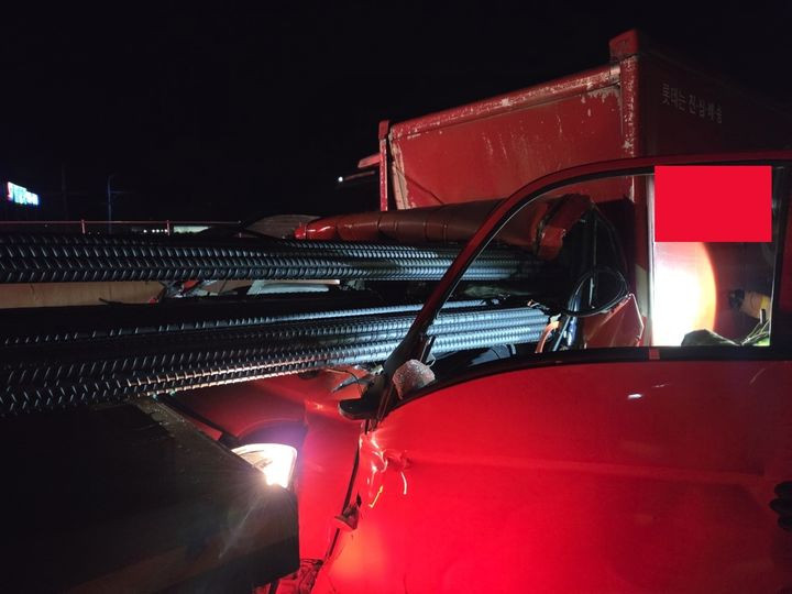 사고 사진[천안동남소방서 제공][천안동남소방서 제공]어젯밤(10일) 10시쯤 경부고속도로 부산방향 천안호두휴게소 부근에서 1톤 화물차가 철근을 싣고 가던 25톤 화물차를 들이받았습니다.