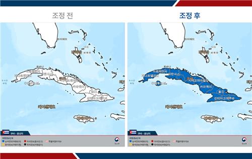 쿠바 여행경보 조정 전후[외교부 제공. 재판매 및 DB 금지][외교부 제공. 재판매 및 DB 금지]외교부는 전염병이 확산하는 쿠바 전역에 대해 한국 시각 12일 오후 9시를 기해 여행경보 1단계(여행유의)를 발령한다고 밝혔습니다.