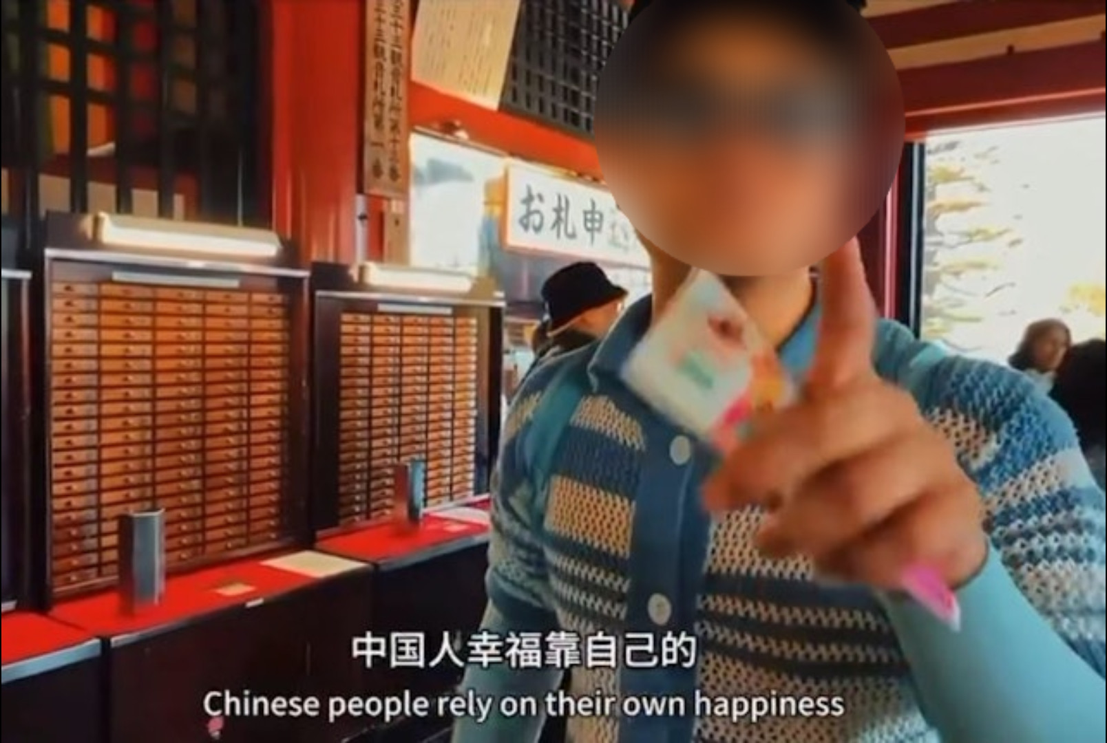이 남성은 "일본 절에서는 이렇게 점괘를 뽑을 수 있다"고 설명하더니, "일본의 점괘는 중국인에게 행복을 가져다 주지 못한다. 중국인의 행복은 스스로 쟁취하는 것"이라고 말합니다.