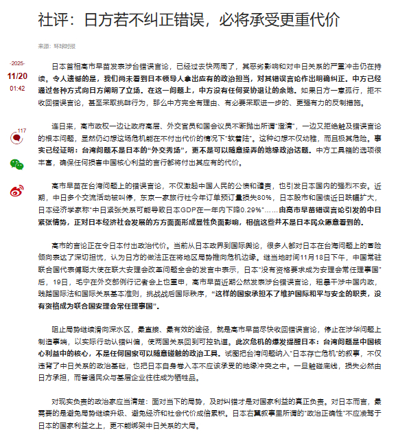 中관영 '환구시보' 논평중국이 다카이치 일본 총리의 대만 관련 발언 철회를 거듭 요구하며, 응하지 않을 경우 더 강력한 조치를 취하겠다고 경고했습니다.