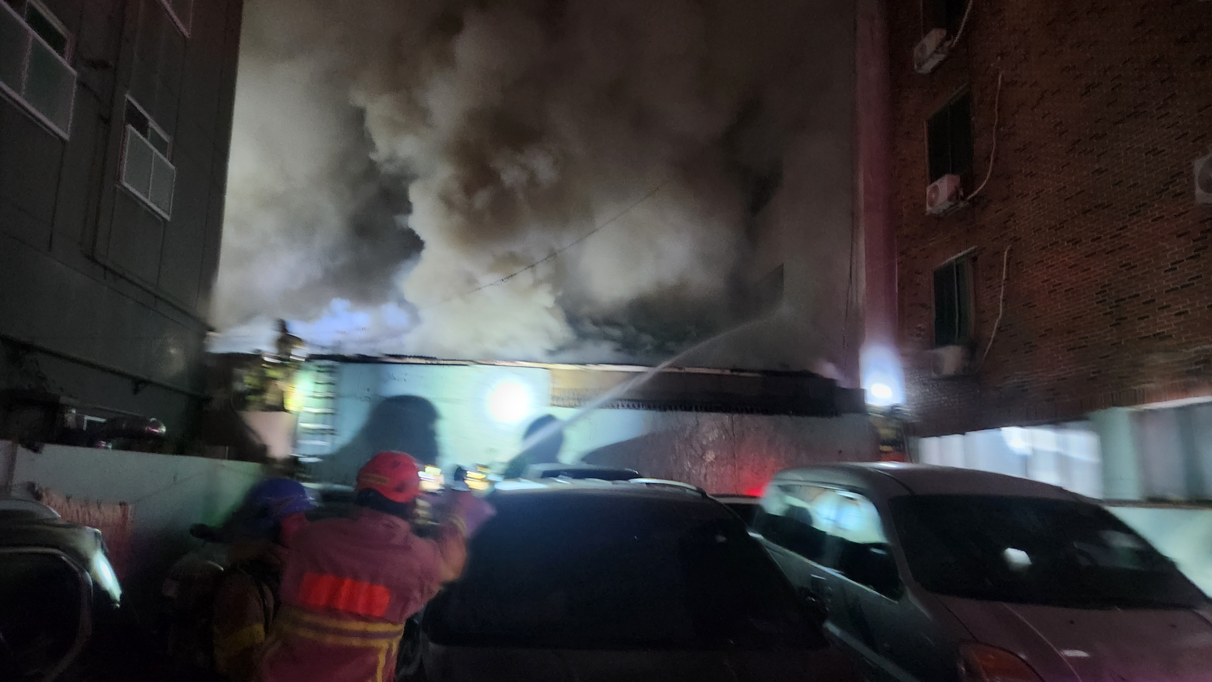 출동한 소방 당국이 장비 29대와 인원 94명을 동원해 진압에 나서 불은 1시간 40분 만에 꺼졌지만, 소방대원 3명이 화상을 입어 치료를 받고 있습니다.