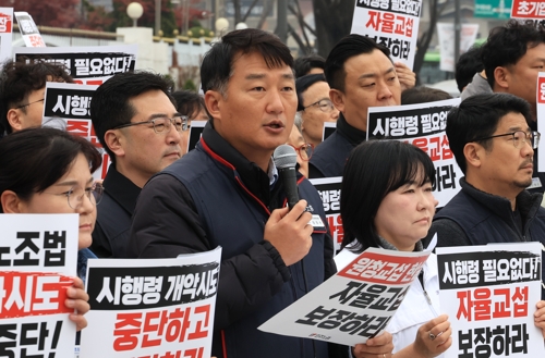 민주노총, 개정 노조법 시행령 규탄 기자회견양경수 전국민주노동조합총연맹 위원장을 비롯한 노동조합 관계자들이 24일 정부서울청사 앞에서 노동부가 발표할 개정 노조법 시행령 관련 긴급 기자회견을 하고 있다. 2025.11.24 [연합뉴스 제공]양경수 전국민주노동조합총연맹 위원장을 비롯한 노동조합 관계자들이 24일 정부서울청사 앞에서 노동부가 발표할 개정 노조법 시행령 관련 긴급 기자회견을 하고 있다. 2025.11.24 [연합뉴스 제공]노동계는 오늘(24일) 고용노동부가 입법예고한 노동조합법 시행령 일부 개정안이 하청노동자의 교섭권을 무력화할 위험이 있다며 폐기를 촉구했습니다.