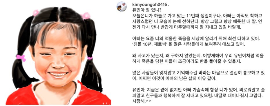 지난 1월 올린 편지에는 “오늘은 네가 하늘로 가고 맞는 11번째 생일”이라며 “항상 그립고 애틋한 내 딸, 언젠가 다시 만나 반갑게 마주하길 바란다”는 문장이 담겼습니다.
