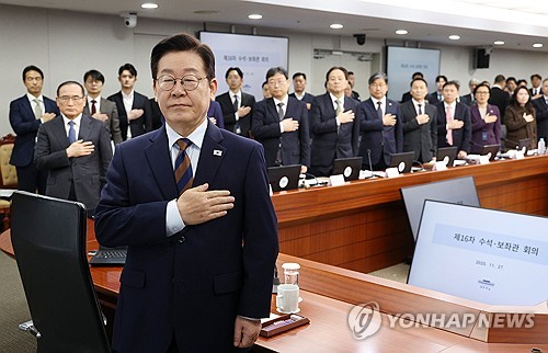이재명 대통령, 수석보좌관회의 참석(서울=연합뉴스) 김도훈 기자 = 이재명 대통령이 27일 서울 용산 대통령실에서 열린 수석보좌관회의에서 국기에 경례하고 있다. 2025.11.27 [대통령실통신사진기자단] superdoo82@yna.co.kr(서울=연합뉴스) 김도훈 기자 = 이재명 대통령이 27일 서울 용산 대통령실에서 열린 수석보좌관회의에서 국기에 경례하고 있다. 2025.11.27 [대통령실통신사진기자단] superdoo82@yna.co.kr