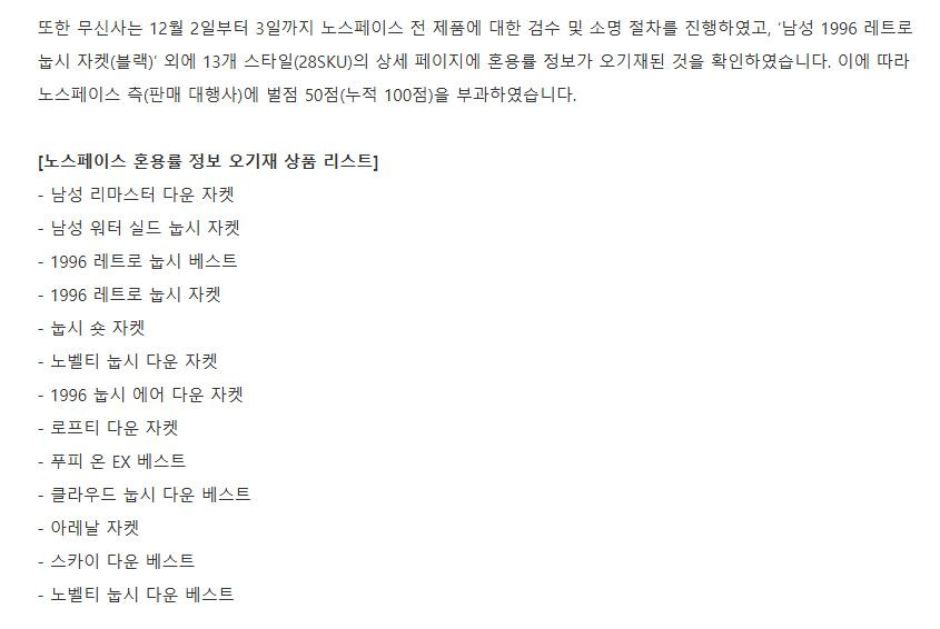 이어 "노스페이스 측(판매 대행사)에 벌점 50점(누적 100점)을 부과했다"고 덧붙였습니다.