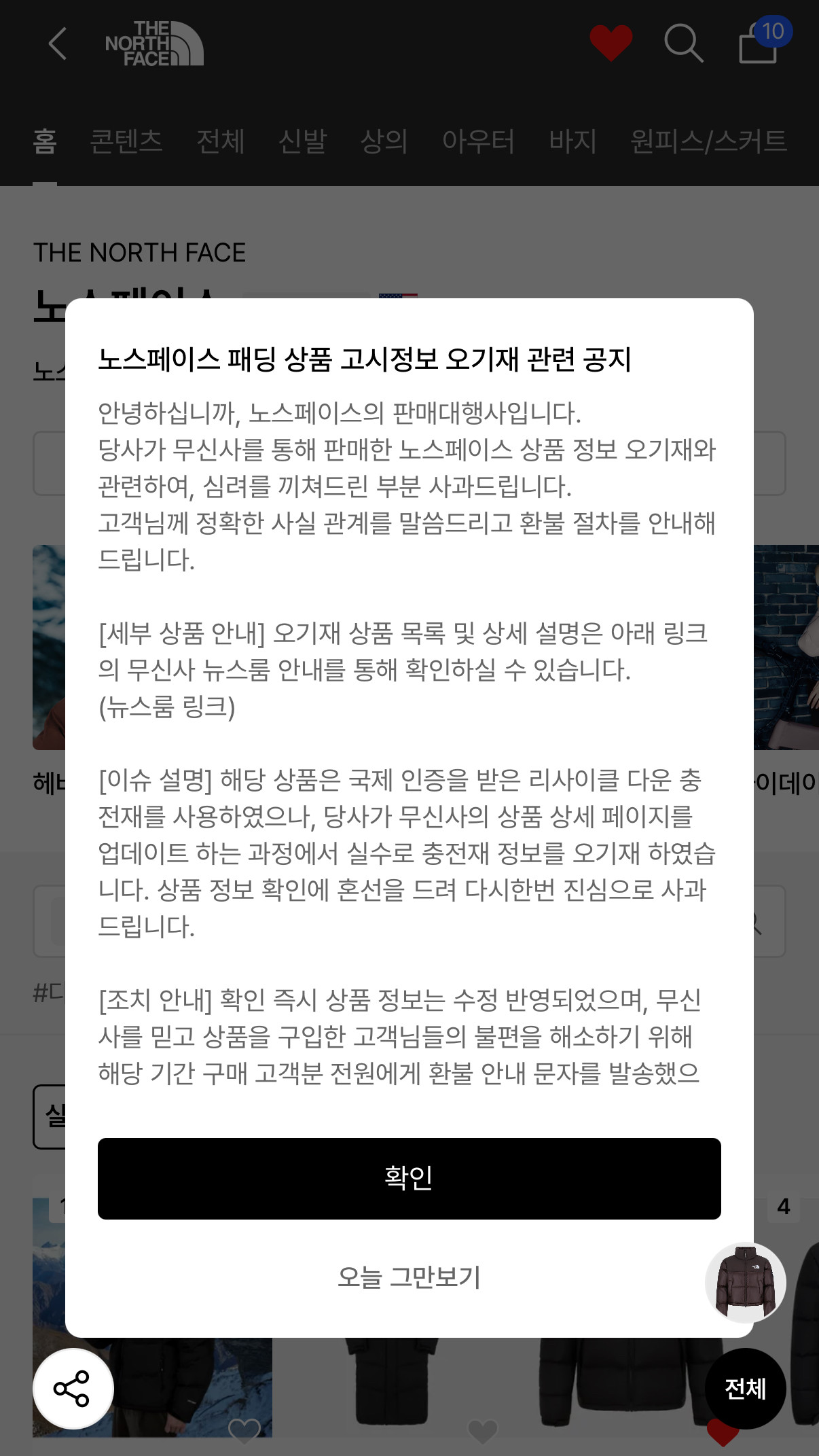 현재 무신사 내 노스페이스 브랜드 페이지에 접속하면, '노스페이스 패딩 상품 고시정보 오기재 관련 공지'가 팝업창으로 나타나고 있습니다.