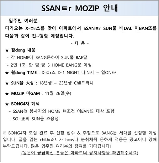 [보배드림 캡처][보배드림 캡처]앞서 지난달에도 'SSANㅌr MOZIP 안내'라는, 이 공지문과 비슷한 산타 봉사자 모집 공지가 올라왔습니다.