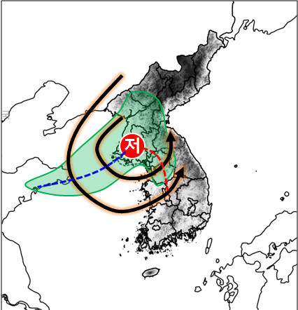 저기압이 대륙의 찬 공기를 품고 남하했는데, 차가운 냉기가 한반도에 먼저 자리하고 있던 상대적으로 따뜻한 공기 밑으로 파고들면서 강한 눈구름대가 발달한 것입니다.