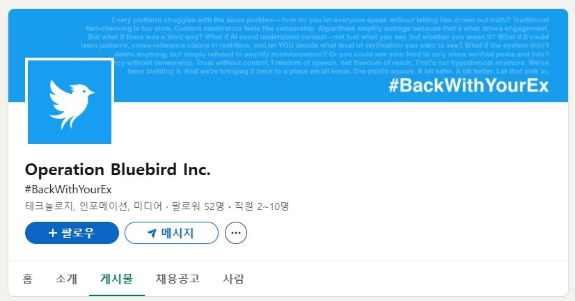 오퍼레이션 블루버드 SNS오퍼레이션 블루버드 SNS한편, 오퍼레이션 블루버드는 공식 SNS를 통해 상표 신청 목적을 "단순히 추억 때문이 아닌, 망가진 것을 바로잡기 위해서"라고 밝혔습니다.