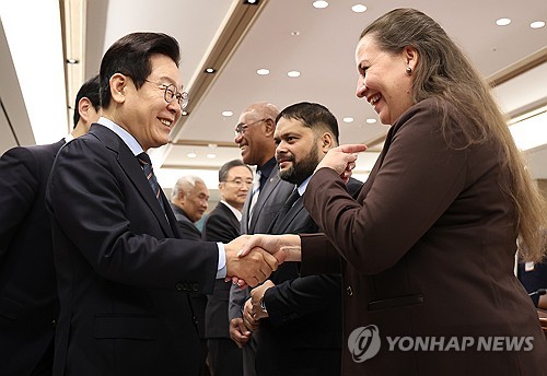 이재명 대통령, 태평양도서국 외교장관 단체 접견(서울=연합뉴스) 김도훈 기자 = 이재명 대통령이 10일 용산 대통령실에서 한-태평양도서국 외교장관회의 참석차 방한한 외교장관들과 인사하고 있다. 2025.12.10 superdoo82@yna.co.kr(서울=연합뉴스) 김도훈 기자 = 이재명 대통령이 10일 용산 대통령실에서 한-태평양도서국 외교장관회의 참석차 방한한 외교장관들과 인사하고 있다. 2025.12.10 superdoo82@yna.co.kr연합뉴스TV 기사문의 및 제보 : 카톡/라인 jebo23