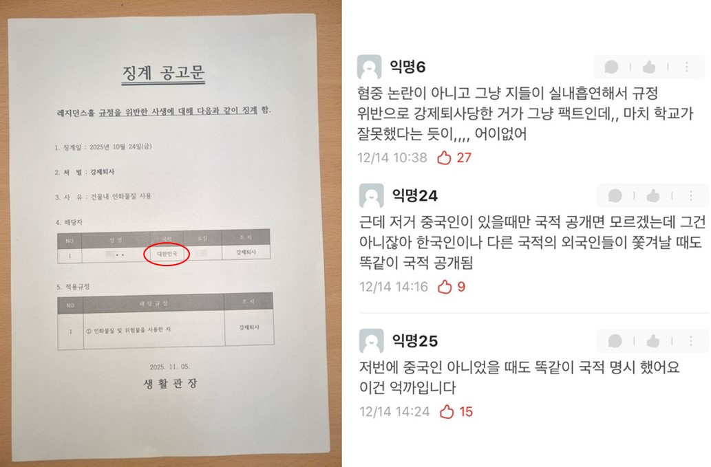 이 공고문이 학교 커뮤니티에 공유되면서, 징계와 직접적인 관련이 없는 국적 공개를 두고 논란이 확산했습니다.