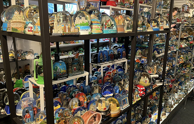 그의 수집품은 옷에 달 수 있는 핀처럼 작은 스노우볼부터 코카콜라 전화기 모양의 스노우볼, 타이타닉 스노우볼, 그의 키보다 더 큰 가로등 모양의 스노우볼까지 다양합니다.