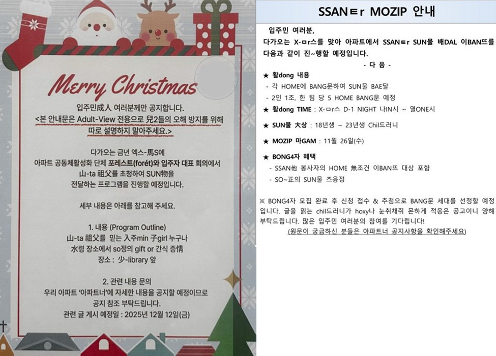 공지문은 "X-ㅁr스 EVE, 사전 신청된 HOME에 산ㅌr가 순차적으로 BANG門(크리스마스이브, 사전 신청된 가정에 산타가 순차적으로 방문)"이라며 "각 HOME에서 미리 준비·포장해 둔 SUN물들을 CHILDz에게 전달(각 가정에서 미리 준비 포장해 둔 선물을 아이들에게 전달)"이라고 안내했습니다.