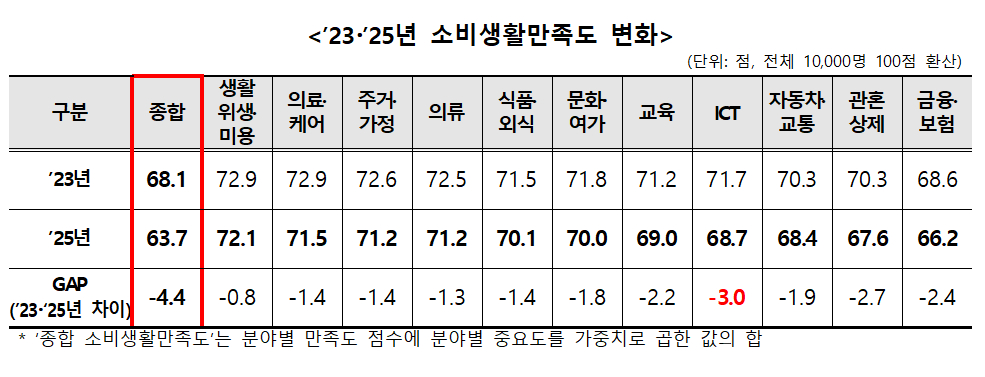 소비생활만족도 변화[한국소비자원 제공][한국소비자원 제공]올해 소비생활만족도는 63.7점으로 지난 2023년 조사보다 4.4점 하락했습니다.