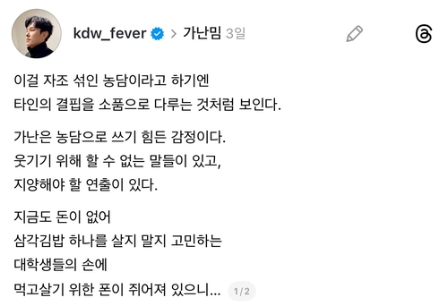 가수 겸 배우 김동완도 가세해 "이걸 자조 섞인 농담이라고 하기엔 타인의 결핍을 소품으로 다루는 것처럼 보인다. 웃기기 위해 할 수 없는 말들이 있고, 지양해야 할 연출이 있다"고 비판했습니다.