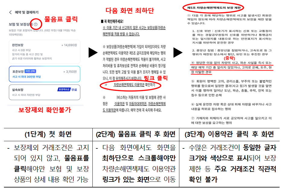 또 소비자에게는 계약 시 자차보험의 보장한도와 면책 제외 등 거래조건을 자세히 살펴보고, 차량 이용 중 사고 발생 시에는 즉시 사업자에게 통보하라고 당부했습니다.