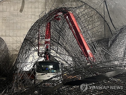 매몰사고 발생한 여의도 신안산선 공사장(서울=연합뉴스) 18일 서울 여의도역 신안산선 공사 현장 지하 약 70미터 지점에서 콘크리트 타설 작업 차량 위를 낙하한 철근들이 뒤덮고 있다.[서울소방재난본부 제공. 재판매 및 DB 금지](서울=연합뉴스) 18일 서울 여의도역 신안산선 공사 현장 지하 약 70미터 지점에서 콘크리트 타설 작업 차량 위를 낙하한 철근들이 뒤덮고 있다.[서울소방재난본부 제공. 재판매 및 DB 금지]
