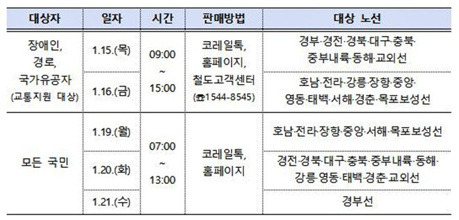 오는 19~21일 오전 7시부터 오후 1시까지는 경로·장애인·국가유공자(교통지원 대상)를 포함한 모든 국민을 대상으로 예매가 진행됩니다.