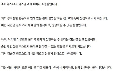 조이웍스앤코는 오늘(7일) "조성환 조이웍스앤코 대표는 이번 사건에 대해 전적으로 본인의 잘못임을 인정하고, 대표이사직에서 사퇴하며 경영 일선에서 물러나겠다는 뜻을 밝혔다"고 전했습니다.