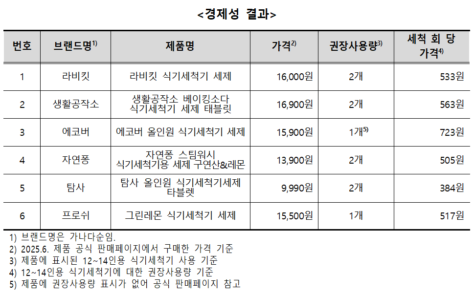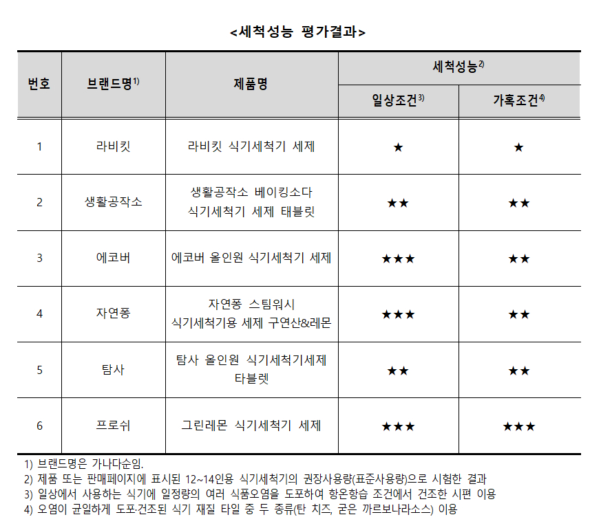 밥알 등 일상 오염조건에서는 '에코버 올인원 식기세척기 세제', '자연퐁 스팀워시 식기세척기용 세제 구연산&레몬', '그린레몬 식기세척기 세제' 등 3개 제품이 상대적으로 우수했습니다.
