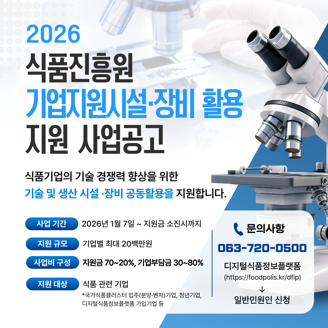 식품진흥원 기업지원시설·장비 활용지원 모집[한국식품산업클러스터진흥원 제공][한국식품산업클러스터진흥원 제공]한국식품산업클러스터진흥원 오늘(13일) 국내 식품산업의 경쟁력을 강화하고 K-푸드 산업의 저변을 넓히기 위해 ‘기업지원시설·장비 활용 사업’ 지원자를 모집한다고 밝혔습니다.