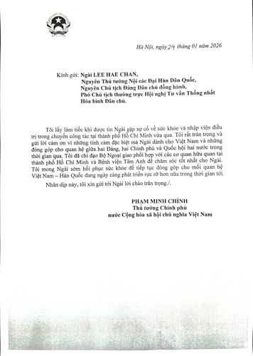 (서울=연합뉴스) 25일 팜 민 찐 베트남 총리가 베트남 출장 중 건강 악화로 위중한 상태에 빠진 이해찬 민주평화통일자문회의 수석부의장의 쾌유를 빌며 우리측에 보내온 서한. 2026.1.25 [조정식 대통령 정무특별보좌관 제공. 재판매 및 DB 금지]