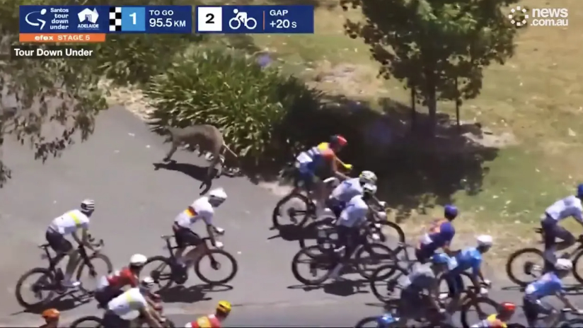 당시 상황이 담긴 영상에는 170km 코스 중 약 100km를 남겨두고 캥거루 한 마리가 나타나 선두 주자를 들이받는 모습이 담겼습니다.