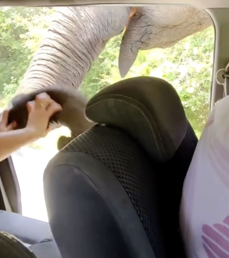 코끼리는 코를 이용해 차량 문짝을 뜯어낸 뒤, 코를 차 안으로 집어넣어 과일을 찾으려 했습니다.