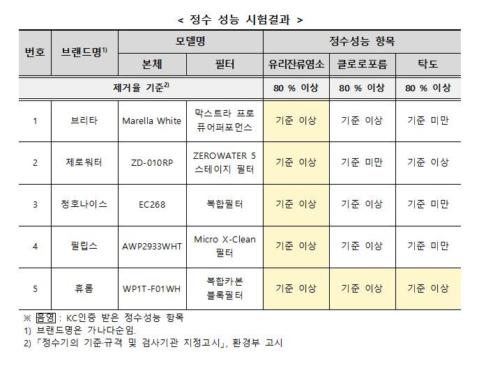 시험 대상은 브리타(Marella White), 제로워터(ZD-010RP), 청호나이스(EC268), 필립스(AWP2933WHT), 휴롬(WP1T-F01WH) 등 5개 브랜드 제품이었습니다.