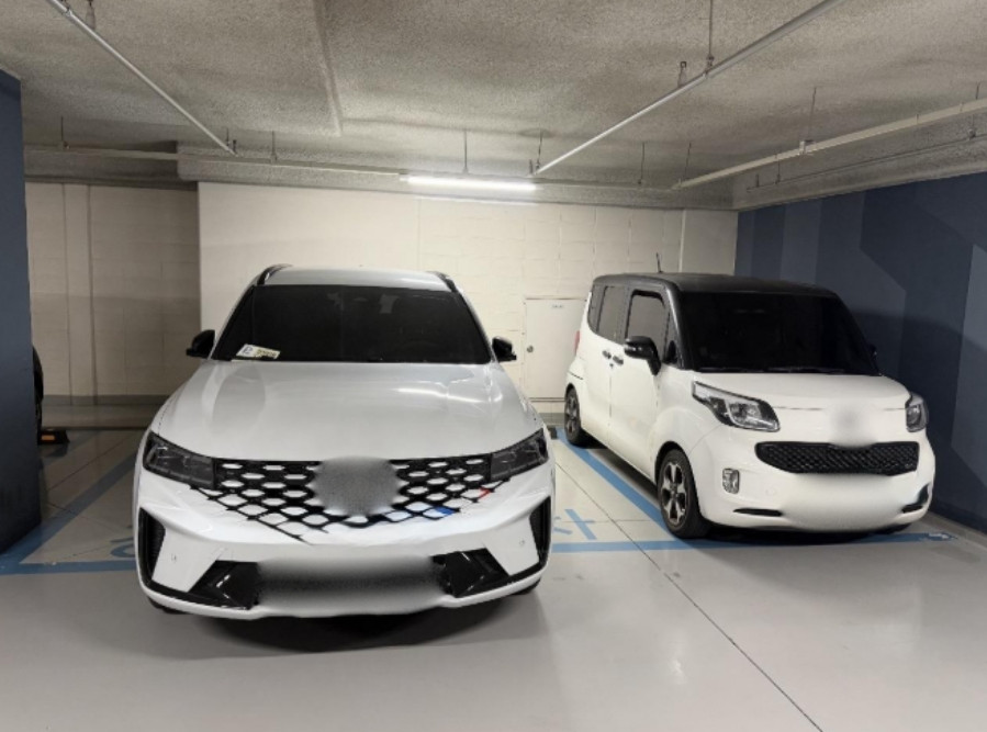 상대적으로 면적이 좁은 경차 전용 구역에서, 주차 칸을 가로질러 차를 세워 놓은 것입니다.