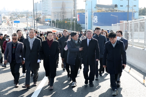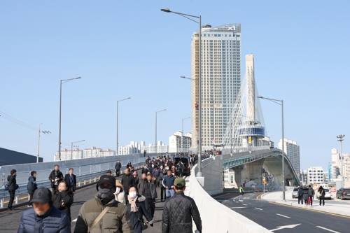 해오름대교 걷는 주요 참석자[화면=연합뉴스. 포항시 제공. 재판매 및 DB 금지][화면=연합뉴스. 포항시 제공. 재판매 및 DB 금지]연합뉴스TV 기사문의 및 제보 : 카톡/라인 jebo23