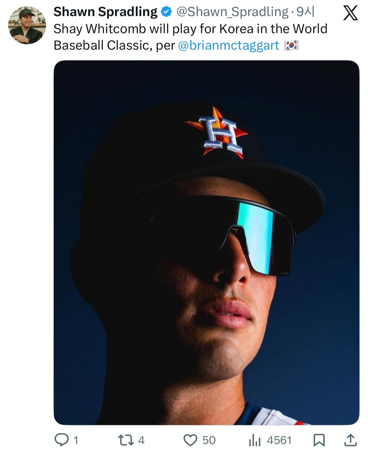 WBC 소식을 전하는 미국 숀 스프래들링 기자는 오늘(4일) 본인 SNS를 통해 "위트컴이 WBC에서 한국 소속으로 뛸 것이다"라고 밝혔습니다.