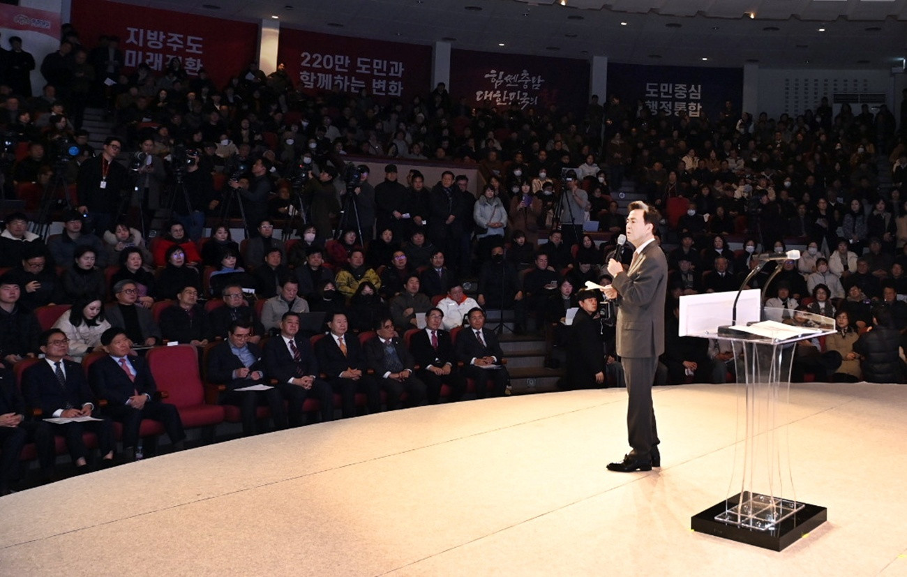 그는 "수도권으로 인적·물적 자원이 빨려 들어가면서 지방은 인구소멸 위기에 처해있다"며 "이런 상황에서 대한민국을 5∼6개 광역권으로 통합해야 하는 이유는 수도권 일극화를 막고 국가 균형발전을 이루기 위한 것"이라고 운을 뗐습니다.