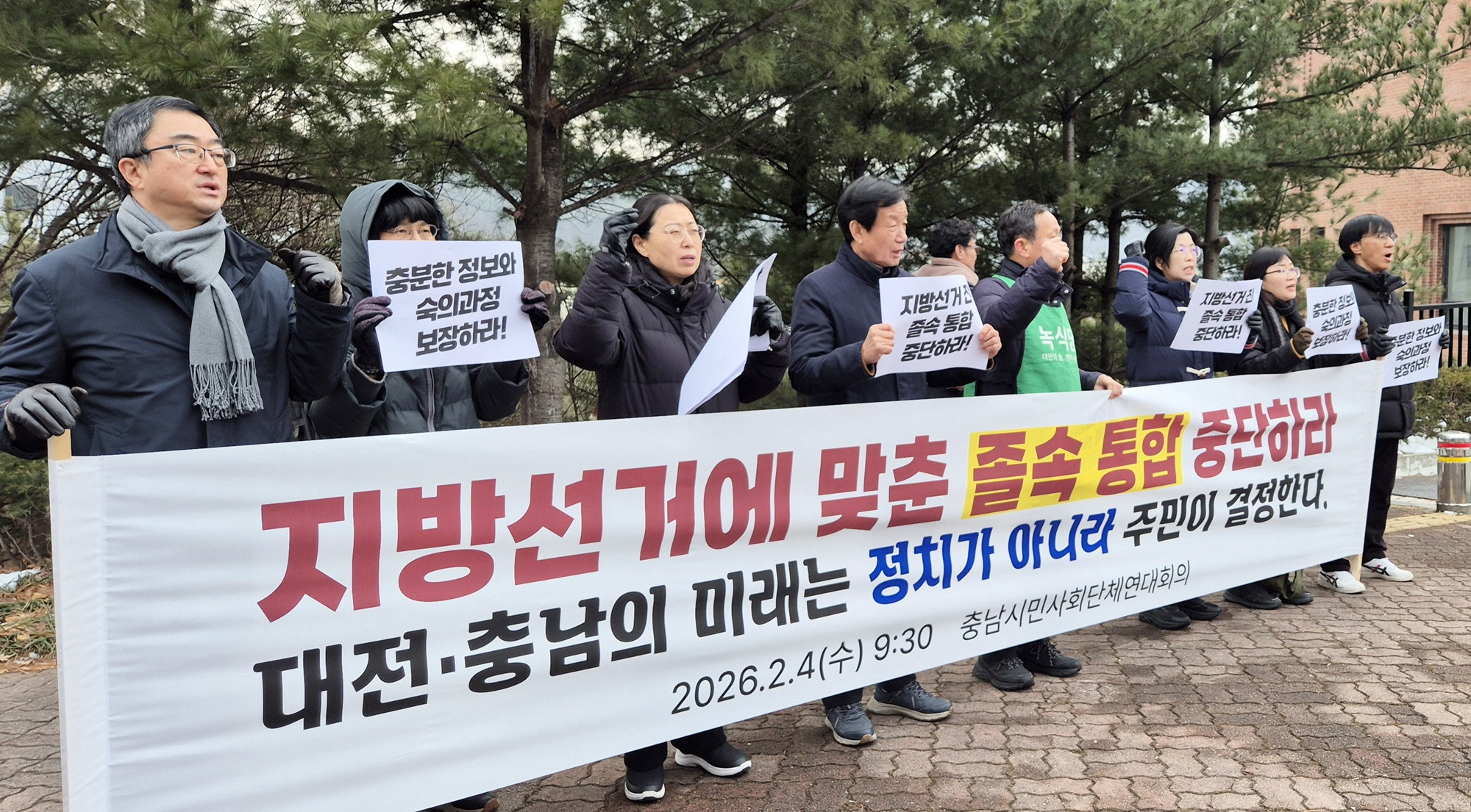 충남지역 30여개 시민단체로 구성된 충남시민사회단체연대회의는 이날 충남도 주최 '대전·충남 행정통합 타운홀미팅'이 열린 단국대 천안캠퍼스에서 기자회견을 열고 "지방선거에 맞춘 졸속 행정통합을 즉각 중단하라"고 촉구했습니다.